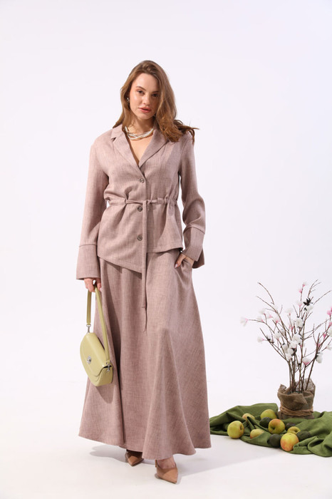 Костюм двухпредметный: состоит из жакета и юбки. Жакет прямого силуэта, воротник пиджачного типа, рукав одношовный, втачной с незначительно спущенной линией плеча, длинный, с притачной манжетой, декорированной разрезом. По линии ткани настрачная кулиса с завязками из основной ткани. Застежка центрально-бортовая. Линия низа верхней части фигурная ассиметричная. Юбка - солнце макси с узким поясом. В боковых швах расположены карманы. Застёжка на петлю и пуговицу и молнию по спинке.