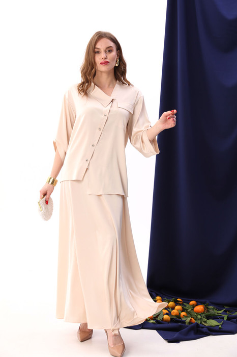 Костюм двухпредметный: состоит из жакета и юбки. Жакет рубашечного типа прямого силуэта с асимметричным низом. Рукав втачной со спущенной линией плеча, фиксируется на пату. Застежка центральная на петли и пуговицы, смещённая по косой. На левой полочке накладной карман с клапаном. Воротник отложной на стойке до половины спинки. Юбка - солнце макси с узким поясом. В боковых швах расположены карманы. Застёжка на петлю и пуговицу и молнию по спинке.