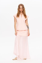 Платье состоит из двух платьев: нижнего и верхнего. Верхнее платье макси с центральной отрезной застёжкой на потайную планку на петли и пуговицы.По переду и спинке цельнокроеные складки на уровне талии. Рукав втачной,одношовный рубашечноно типа. По низу рукава пробиты петли и вставлена завязка для фиксации сборки . Воротник рубашечный стояче отложной. Нижнее платье комбинация на регулируемых бретелях.