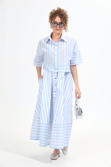 Костюм двухпредметный: состоит из рубашки и юбки. Рубашка укороченная прямого силуэта  с притачной планкой с застёжкой на петли и пуговицы. Рукав короткий одношовный со спущенной линией плеча. Воротник  рубашечный стояче-отложной. Юбка - солнце с узким поясом. В боковых швах расположены карманы. Застёжка центральная на петли и пуговицы. В комплект к юбке идет широкий пояс из основной ткани.