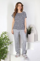 Костюм двухпредметный: состоит из жакета и юбки. Жакет прямого силуэта с имитацией центральной застёжки на пуговицы. Рукав втачной одношовный, длиной три четверти,застегивающийся на пату. Воротник пиджачного типа . Линия низа фигурная, симметричная . По левому переду расположена декоративная деталь. Юбка длиной миди, расклешенная к низу, с асимметричным низом. Пояс притачной, по спинке собран на резинку. Переднее полотнище состоит из трех частей. Правая часть скреплена отделочной строчкой и кнопками. В боковых швах изделия расположены карманы. По спинке изделия идёт средний шов и две вытачки для удачной посадки по фигуре. Юбка без подкладки.