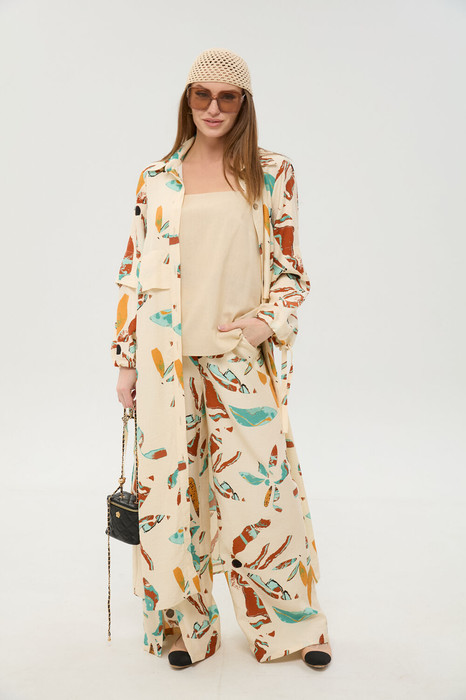 Костюм трехпредметный: состоит из кардигана-платья, брюк и топа. Платье-кардиган макси с центральной отрезной застёжкой на потайную планку на петли и пуговицы. По переду и спинке цельнокроеные складки на уровне талии. Рукав втачной, одношовный рубашечного типа. По низу рукава пробиты петли и вставлена завязка для фиксации сборки . Воротник рубашечный стояче отложной. В комплект к изделию идёт пояс из основной ткани для максимально комфортного регулирования объёма. Брюки свободного кроя, верхний срез представлен широкой резинкой, с карманами. По центру правой брючины расположена планка с функционирующими петлями и пуговицами. Топ на тонких регулируемых бретелях.