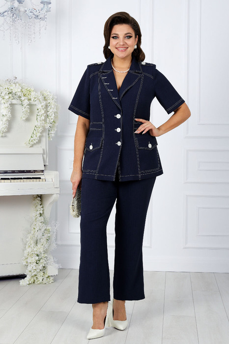 Особенностью этого костюма является контрастная двойная отделочная строчка на жакете. Эти элементы не только добавляет интереса к образу, но и создает визуальное подчеркивание, что помогает создать идеальный силуэт для женщин с большими размерами. Контрастные строчки выгодно подчеркивают форму жакета, делая его более стройным и элегантным.