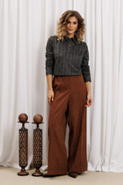 Брюки классические длинные, прямого силуэта, с посадкой на талии, выполнены из трикотажного полотна «велюр». Модель с центральной застёжкой на тесьму-«молнию», на притачном поясе, застегивающемся на петлю и пуговицу. Передние и задние половинки брюк с талиевыми вытачками, направленными от пояса вниз. Спереди обработаны боковые наклонные карманы. Для лучшего прилегания брюк в области талии в поясе по задним половинкам вставлена эластичная лента. Длина брюк по боковому (с поясом)-107 см (52-54 р-р), 108 см (56-60 р-р).