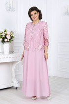 Жакет двубортный, полуприлегающего силуэта, выполнен из костюмной поливискозы. Модель на подкладке, с плечевыми накладкам. Спереди обработаны рельефные швы, направленные от пройм до низа; в нижней части переда расположены прорезные карманы с клапаном, в верхней, слева – имитация прорезного кармана с листочкой. Перед со смещенной внешней застежкой на 2 декоративные пуговицы и внутренней на 2 потайные. Спинка со средним швом. Воротник пиджачного типа. Рукав длинный, втачной. Правая сторона жакета дополнена декоративной вставкой, имитирующей двойную деталь переда. Длина жакета - 68 см; длина рукава - 61 см.