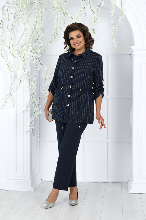 Комплект брючный 3-х предметный, состоящий из жакета, джемпера и брюк. Жакет прямого силуэта, выполнен из ткани «лен-вишер». Модель без подкладки, с плечевыми накладками и однобортной внешней застежкой с отрезными планками на 7 петель и 7 пуговиц. Перед с нагрудными вытачками, выходящими из пройм. По спинке и частично по переду настрочена кулиса, в которую втянут поясок из основной ткани. Для регулировки сборки по кулисе предусмотрены фиксаторы, концы пояса оформлены наконечниками. Горловина округлой формы со стояче-отложным воротником на отрезной стойке. Рукав втачной, длинный, с притачной манжетой, застегивающейся на 1 петлю и 1 пуговицу; по середине рукава настрочена пата, застегивающаяся на 1 петлю и 1 пуговицу, что позволяет регулировать длину рукава. Длина жакета - 71 см (46-50 р-р), 72 см (52-60 р-р), 73 см (62-66 р-р). Длина рукава (с манжетой) - 61 см. Джемпер полуприлегающего силуэта, выполнен из вискозного трикотажного полотна. Перед с нагрудными вытачками, выходящими из пройм. От горловины вниз застрочены 4 складки. Горловина переда и спинки округлой формы, по переду углубленная. Срезы горловин окантованы косой бейкой. Рукав втачной, короткий. Длина джемпера -60 см (46-50 р-р), 65 см (52-60 р-р), 67 см (62-66 р-р). Длина рукава – 24,5 см (46-50 р-р), 25,5 см (52-60 р-р), 26,5 (62-66 р-р). Брюки классические длинные, прямого силуэта, с посадкой на талии, выполнены из ткани «лен-вишер». Модель без застёжки, на притачном поясе, с эластичной лентой внутри. Передние половинки брюк с боковыми наклонными карманами. Длина брюк по боковому (с поясом)-103 см (46-54 р-р), 104,5 см (56-60 р-р), 106 см (62-66 р-р).