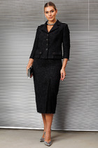 Жакет отрезной по линии талии, выполнен из трикотажного полотна с фактурной лицевой стороной «люрекс». Модель на подкладке, с плечевыми накладками; без воротника, с V-образным вырезом горловины. В верхней части переда заложены 3 односторонние складки, направленные от талии к центру груди, и 3 односторонние складки на баске, направленные к низу. На спинке обработаны талиевые вытачки. Борта и горловина оформлены отрезной планкой. Жакет с однобортной застежкой на 5 прорезных петель и 5 пуговиц, обтянутые основным материалом. Рукав длинный, втачной. Длина жакета-68 см. Длина рукава-61 см.