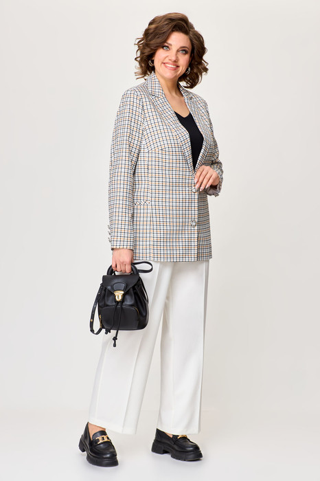 Представьте себе величественную даму, идущую с изяществом и уверенностью, восхищающую всех своим непринужденным стилем. Её образ – это искусное сплетение элегантности и современной роскоши. На ней – женский брючный костюм, созданный для того, чтобы притягивать восхищенные взгляды. Пиджак, в котором она словно воплощает элегантность и власть, олицетворяет роскошь и стиль. Он выглядит как произведение искусства: однобортный, с центральной застёжкой на две изысканные пуговицы, создающие ощущение истинного роскошного шика. Отложной воротник с лацканом придает образу особый шарм и респектабельность. Спинка и перед пиджака украшены изысканными рельефами, которые подчеркивают женственные линии фигуры. Прорезные карманы в листочку дополняют его стиль и функциональность, а подкладка добавляет ощущение роскоши и комфорта. Брюки, с другой стороны, придают образу современную строгость и изысканность. Прямой покрой создает идеальные линии, подчеркивая изящную фигуру. Они выполнены из однотонной ткани, которая великолепно гармонирует с клетчатым пиджаком. Брюки с боковыми карманами добавляют удобство и практичность, а пояс на резинке обеспечивает комфорт. Этот брючный костюм – это не просто одежда, это произведение искусства, которое подчеркивает индивидуальность и утонченный вкус своей обладательницы. Он создан для того, чтобы притягивать восхищенные взгляды и оставаться в памяти как воплощение элегантности и стиля.