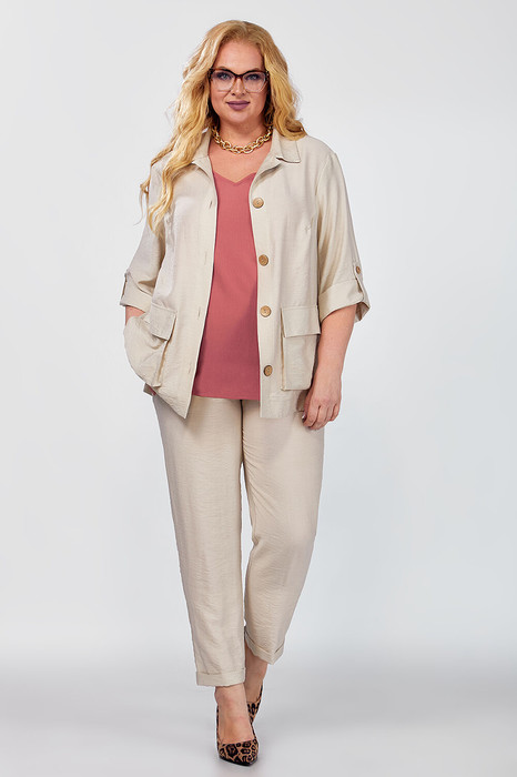 Стильный женский комплект-тройка ALGRANDA: рубашка-жакет с брюками и созвучной майкой – это стильное и комфортное решение для женщин больших размеров, идеальный выбор для тех, кто ценит комфорт и стиль. Модель выполнена из ткани из натурального волокна - хлопка с добавлением полиэстера и эластана, что позволяет чувствовать прохладу в жару, она прекрасно сидит на фигуре, обеспечивая свободу движений и приятные тактильные ощущения. Жакет свободного прямого кроя со спущенными рукавами, застегивается на 5 пуговиц и дополнен двумя накладными карманами, по боковым швам обработаны разрезы, низ жакета асимметричный. Блуза с рукавом «крылышко», горловина углубленная V-образной формы, на правом боковом шве есть декоративная нашивка. Брюки-бананы с отложными манжетами и боковыми карманами обеспечивают удобную посадку. Свободный крой комплекта позволяет носить его как в офисе, так и в повседневной жизни. Модель представлена в широком размерном ряде, что делает ее доступной для женщин с любыми параметрами. Это идеальный женский костюм как для прогулки, так и для похода в офис.