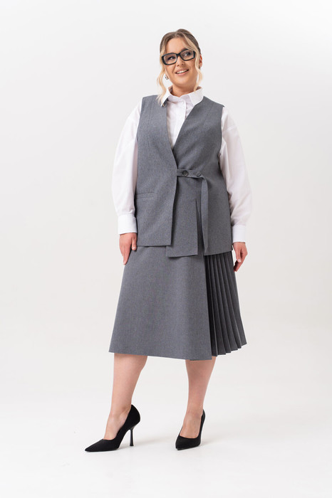 Костюм с юбкой миди  – это изысканный выбор для особых моментов вашей жизни. Этот элегантный наряд создан для тех, кто ценит стиль и комфорт. Костюм выполнен из высококачественного "дышащего" материала, поливискозы, что обеспечивает её долговечность. Фактура материала придает костюму особенный шарм. Классический жилет с V-образным  вырезом горловины превосходно садится по фигуре, на правой полочке обработан прорезной карман с листочкой, на левой - разрез, застежка обработана на отлетном хлястике, на петлю и пуговицу. Этот элемент делает его более интересным. Жилет на подкладке. Плиссированная деталь юбки добавляет легкости и изящества, делая ваш образ особенно привлекательным. На юбке в боковом шве обработан карман. Удобная посадка пояса юбки, частично на  резинке с потайной молнией по среднему шву спинки - это комфорт и свобода движений на весь день. Костюм легко сочетается с любыми аксессуарами, позволяя вам экспериментировать с вашим стилем.