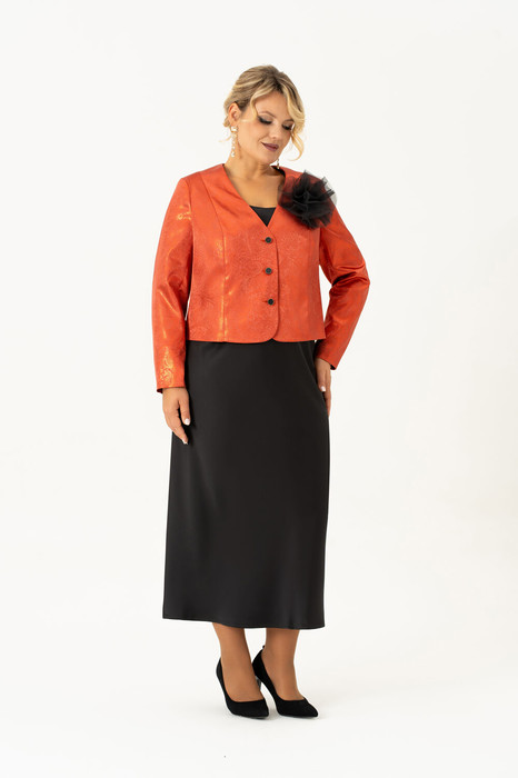 Элегантный женский комплект «двойка» больших размеров — идеальный выбор для женщин с пышными формами, который сочетает в себе комфорт, стиль и изящество. Модель состоит из двух элементов: лаконичного платья из струящегося атласа, кроеного по косой и короткого жакета, полуприлегающего силуэта на подкладке. Такой тандем создает утонченный и женственный образ, который прекрасно подойдет как для вечерних выходов, торжеств, так и для повседневного ношения или работы в офисе. Жакет полуприлегающего силуэта, с центральной застёжкой на петли и пуговицы и с рельефами от плеча по переду, закругленный низ борта. Спинка в жакете со средним швом . Рукав втачной, двухшовный, длинный. Платье кроенное по косой, что обеспечивает красивую посадку и мягкое облегание по фигуре. Углубленная горловина добавляет лёгкой чувственности, а нагрудные вытачки от проймы подчёркивают линию груди. В комплекте идет съемный цветок- брошь.