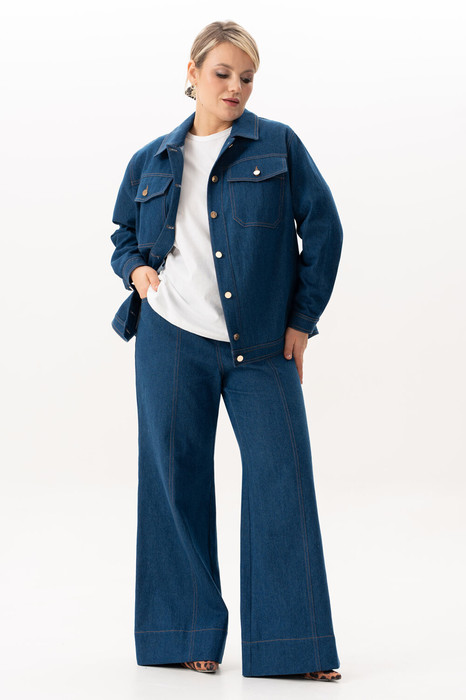 Предлагаем Вам супермодный джинсовый костюм в стиле 70-х — это стильный выбор для современной девушки или женщины. Джинсовый костюм двойка состоит из брюк-клеш и жакета-куртки средней длины на пуговицах, что делает его универсальным выбором. Два накладных нагрудных кармана с клапанами на пуговицах, два боковых кармана в рельефе и 2 внутренних кармана в жакете и пять в брюках добавляют ему функциональности, позволяя всегда иметь под рукой необходимые мелочи. Этот стильный весенний, летний, осенний брючный костюм создан из 100% хлопка, что делает его комфортным при любой температуре и очень приятным к телу. За счет плотной джинсовой ткани, костюм сохраняет свой первоначальный вид на долгое время. Модель с джинсами выполнена в духе классики, но при этом остается актуальной и трендовой на все времена. Возможность носить элементы раздельно — это важное преимущество. Джинсы клеш с высокой посадкой и широкими расклешёнными брючинами от колена. Низ брючин с широким отворотом и контрастной строчкой. Пояс со сшевками, застегивается на петлю и металлическую пуговицу. Вертикальные швы на брючинах визуально удлиняют силуэт. Мягкая эластичная резинка в поясе брюк обеспечивает комфортную посадку без стеснения движений, адаптируется к особенностям фигуры и не создаёт давления на талию, позволяя носить костюм целый день с лёгкостью. Джинсы с завышенной талией станут универсальным элементом гардероба как на каждый день, так и на праздничное мероприятие. Куртка-жакет легко комбинируется с другими элементами гардероба, сохраняя при этом классический образ. Если добавить парочку модных аксессуаров, то костюм легко трансформируется в наряд для вечеринки, дня рождения или другого значимого торжества. Не упустите возможность сделать заказ костюма прямо сейчас и приковывать к себе все взгляды окружающих уже сегодня!