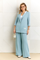 Костюм женский, состоящий из блузы и брюк, выполнен из ткани в полоску.