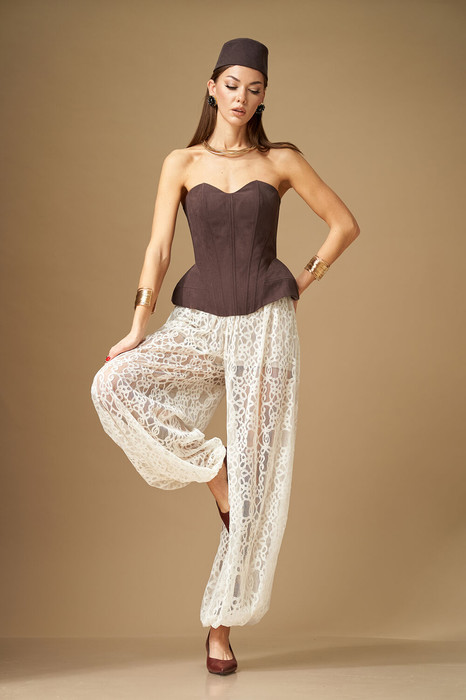 Брюки свободной формы, с низкой посадкой, сильно расширенные и собранные снизу на резинку, выполнены из кружевного полотна. Верхний срез обработан поясом на резинке, центр переда без резинки, пояс со шлевками. В пояс притачены короткие шорты из трикотажного полотна. Брюки по силуэтной форме – Алладины.