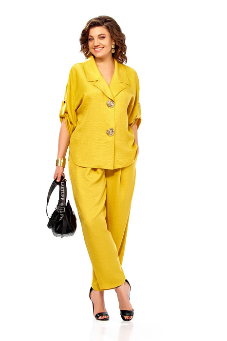 Шикарный костюм  свободного силуэта. Застежка на две декоративные металлические кнопки. Воротник пиджачного типа. Рукав спущенный с патой, застегивающейся на пуговицу. Низ фигурной формы.  Брюки свободные, зауженные к низу, с вертикальной вставкой вдоль бокового шва. По переду заложены односторонние складки. По спинке отрезная кокетка. Карманы в боковых швах. Верхний срез обработан притачным поясом.
