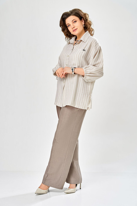 Интересный комплект, состоящий из блузы свободного силуэта и брюк прямого кроя. Блуза с центральной застежкой на петли и пуговицы, воротником рубашечного типа. Рукав спущенный, по низу резинка, длина 3/4. Слева накладной карман, разрезы в боковых швах. Брюки со стрелками, карманы в боковых швах, пояс частично на резинке.