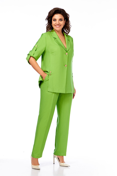 Жакет полуприлегающего силуэта, с пиджачным воротником, застежка на две пуговицы. На полочке шлицы  с декоративными шлицами. Спинка со средним швом. Рукав втачной, длиной три четверти, регулируется патой. Брюки прямые, пояс на резинке, карманы в боковых швах.