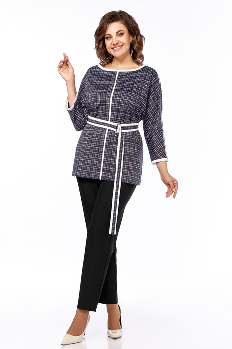 Стильный комплект: блуза из трикотажного полотна, брюки текстиль. Блуза прямого силуэта с цельнокроеным рукавом длиной три четверти, контрастной белой отделкой и сьемным поясом из основной ткани. Брюки прямые, слегка заужены к низу, пояс на резинке, карманы от пояса к боковым швам, по переду и спинке заутюжены канты.