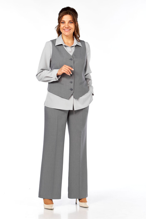 Комплект женский, состоит из блузки, жилета и брюк. Полуприлегающий силуэт, жилет с V-образной формой горловины, на переде рельефы от проймы, имитация карманов в рамку, по спинке хлястик с пуговицей. Блузка с рубашечным воротником и застежкой на петли и пуговицы, нагрудные вытачки, рукав одношовный с манжетой. Разрезы в боковых швах. Брюки прямые, с карманами. Пояс по спинке на резинке. На переде и спинке заутюжены стрелки.