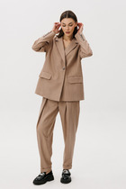 Стильный костюм, из сочетания двух видов ткани. Жакет из мягкой плотной костюмной ткани, прямого силуэта. Пиджачный воротник, двубортная застежка, карнамы с клапанами. Слева вверху декоративная листочка. По спинке шлица. Рукава втачные, внизу шлицы и пуговицы. Брюки прямые, пояс по спинке на резинке, карманы в боковых швах. Заутюжены стрелки.