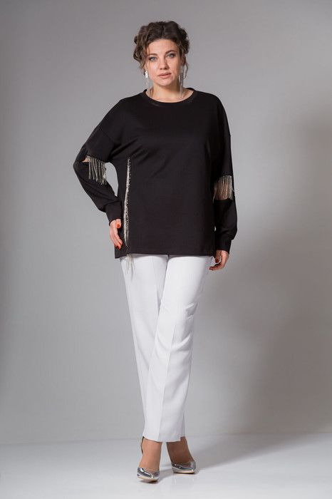 Блузон прямого силуэта, свободной формы, покроя спущенное плечо. Горловина округлой формы, обработана планкой. Спинка цельная. На переде расположены нагрудные вытачки, а так же подрез с правой стороны от вытачки, переходящий в разрез, дополнен тесьмой-бахромой со стразами. Рукава полной длины, низ обработан манжетами. На рукавах ассиметрично расположены прорезы, задекорированные тесьмой-бахромой со стразами. Блузон выполнен из трикотажного полотна.