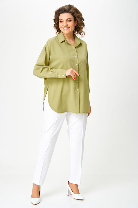Рубашка свободной формы, покроя спущенное плечо с центрально бортовой застежкой на петли-пуговицы (отрезная планка). Горловина оформлена стояче отложным воротником с отрезной стойкой. Рукав одношовный, по низу со складкой и разрезом, обработанным фигурной планкой, рукав оформлен манжетой, застегивающейся на 2 пуговицы. В боковых швах расположены высокие разрезы закругленной формы. На спинке горизонтальная кокетка, на нижней части заложена встречная складка. Спинка длиннее, перед короче.
