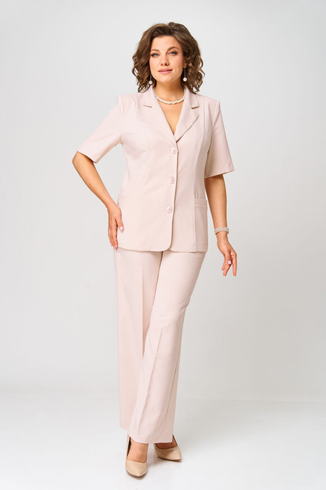 Комплект женский, состоящий из жакета и брюк, выполнен из однотонной костюмно-плательной ткани.