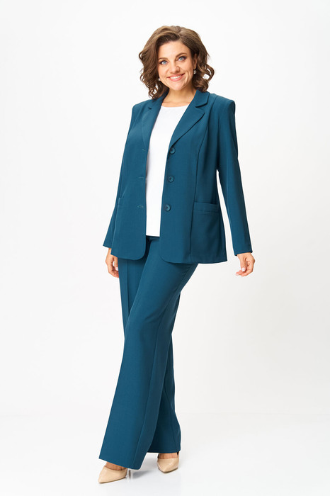 Жакет полуприлегающего силуэта, втачного покроя с центрально-бортовой застежкой на три петли-пуговицы. По переду расположен рельеф из плевого шва, в боковой части выполнен карман с листочкой. Спинка со средним швом и талиевыми вытачками. Горловина оформлена воротником пиджачного типа, рукав короткий, низ переда закругленный. Рукав длинный, двухшовный