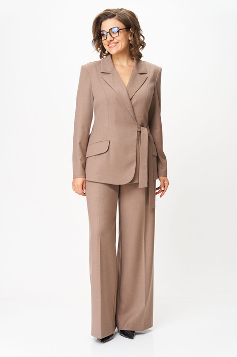 Жакет полуприлегающего силуэта с двубортной застежкой, завязывающейся на пояс. Воротник пиджачного типа. Рукав длинный, двушовный, втачной, плечо слегка расширено. Спинка со средним швом и рельефом из плечевого шва. По переду полурельеф из плеча, заканчивающийся вытачкой, обработаны прорезные карманы с листочкой и клапаном. Низ борта закругленный.