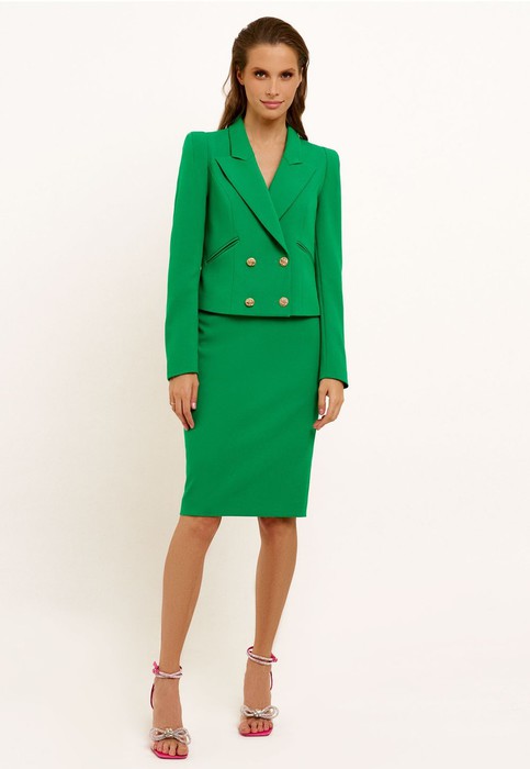 Стильный женский костюм с жакетом и юбкой решит вопрос с созданием образов в официальном стиле. Трикотажный костюм женский хорошо подойдет для прохладного лета и межсезонья. Укороченный жакет с двубортным воротником украшен четырьмя пуговицами, по две в ряд. Дополняет его прямая юбка длиной до колена. Костюм пиджак и юбка женские можно носить самостоятельно или сочетать с майками, футболками, блузками. Для завершения строгих образом подойдут туфли-лодочки на каблуке. Закажите классический юбочный костюм по выгодной цене уже сегодня.