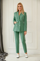 Стильный лаконичный брючный костюм. Жакет с застежкой на одну пуговицу. Жакет полуприлегающего силуэта, с V-образным вырезом горловины. По переду и по спинки имеются вытачки и рельефы, которые обеспечивают отличную посадку изделия по фигуре. Рукава втачные, длиной 3/4. Брюки классические на поясе, укороченые, с карманами по переду. Отличный вариант как для деловых встреч, так и для торжественных мероприятий.