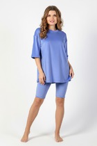 Костюм из гладкокрашеного трикотажного полотна «велюр стрейч», состоящий из футболки и леггинсов. Футболка – удлиненная, свободного покроя, со спущенной, линией плеча, короткими втачными рукавами, горловиной овальной формы, обработанной втачной планкой.Леггинсы – длиной до колен, с эластичной тесьмой по талии.