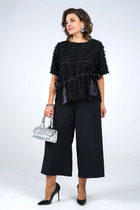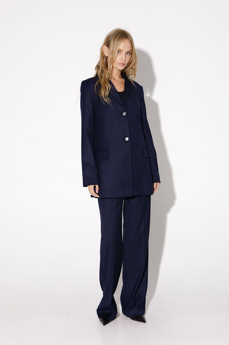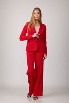 Текстильный костюм-двойка из трапециевидного жакета с высокой шлицей по спинке и прямых брюк со стрелками. Детали: свободный покрой, пиджачный воротник, талиевые вытачки, функциональный нагрудный карман, прорезные карманы с клапанами, застежка на пуговицы, спинка со средним швом и высокой шлицей, рукава втачные двухшовные, жакет на подкладке. Брюки с высокой посадкой на притачном поясе со шлевками, передние половины с небольшими застроченными мягкими складками и заутюженными стрелками, застежка на молнию и пуговицу, боковые карманы.