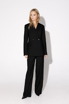 Классический костюм-двойка из двубортного жакета и укороченных брюк со стрелками.