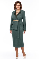 Детали: жакет полуприлегающего силуэта, пиджачный воротник, перед с прорезными карманами, двубортная застежка на петли и пуговицы, спинка со средним швом, рукава втачные двухшовные, жакет на подкладке. Брюки со средней посадкой, притачной пояс со шлевками, передние половины с небольшими мягкими складками и заутюженными стрелками, застежка на молнию и пуговицу, боковые карманы.