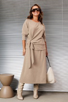 Длина жакета по спинке около 66 см в размерах 40-46 и около 69 см в размерах 48-52, длина рукавов около 61 см. Длина брюк по боковому шву с поясом около 97 в размерах 40-46 и около 98,5 см в размерах 48-52, длина по внутреннему шву около 70 см.