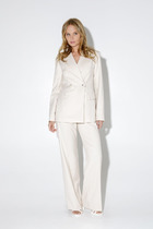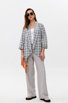 Текстильный костюм-двойка из жакета со шнуровкой с расширенной линией плеч и классических укороченный брюк со стрелками.