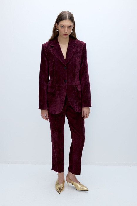 Детали: прямой силуэт, пиджачный воротник, функциональные карманы, застежка на петли и пуговицы, рукава втачные двухшовные, жакет на подкладке. Брюки с высокой посадкой на притачном поясе со шлевками, передние половины с небольшими застроченными мягкими складками и заутюженными стрелками, застежка на молнию и пуговицу, боковые карманы. Задние части брюк с вытачками и имитацией карманов.