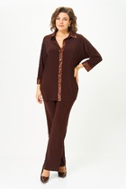 Длина жакета по спинке около 69 см в размерах 40-46 и около 72 см в размерах 48-52, длина рукавов около 62 см. Длина брюк по боковому шву с поясом около 109,5 см, длина по внутреннему шву около 83 см.