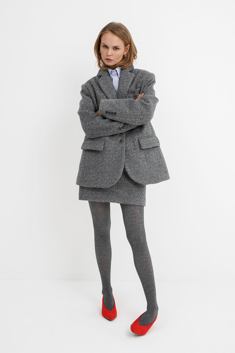 Костюм-двойка из оверсайз жакета и мини-юбки из фактурной пальтовой ткани.