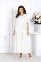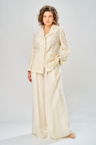 Длина жакета по спинке около 69 см в размерах 40-46 и около 72 см в размерах 48-52, длина рукавов около 62 см. Длина брюк по боковому шву с поясом около 113 см в размерах 40-46 и около 114,5 см в размерах 48-52, длина по внутреннему шву около 82 см.