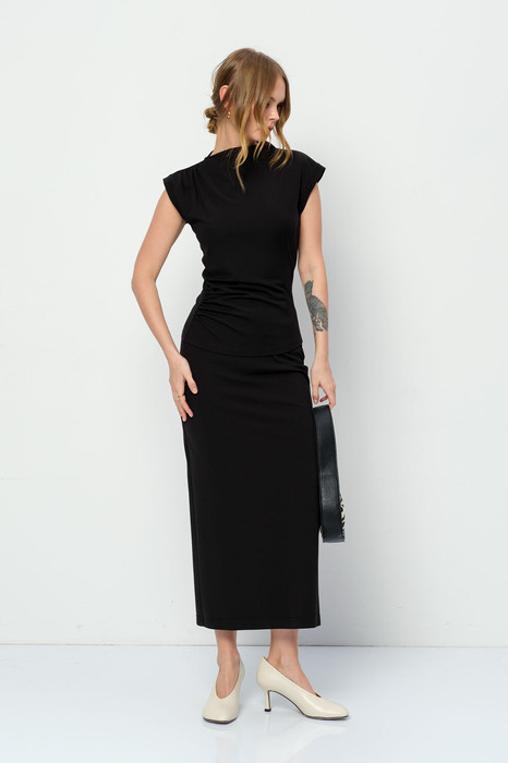 Трикотажный костюм-двойка из облегающей асимметричной блузы и миди-юбки.