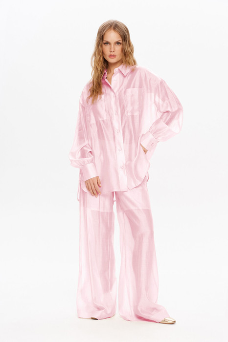 Полупрозрачный костюм-двойка из свободной рубашки и широких брюк на резинке.