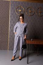 Текстильный костюм-двойка из приталенного жакета фурнитурой под золото и укороченных брюк со стрелками. Детали: пиджачный воротник, нагрудные вытачки, прорезные карманы с фигурными клапанами, рукава втачные со шлицей, съемный пояс, жакет на подкладке; брюки со средней посадкой на притачном поясе, на передних половинах складки и заутюженные стрелки, застежка на молнию и пуговицу, боковые карманы.