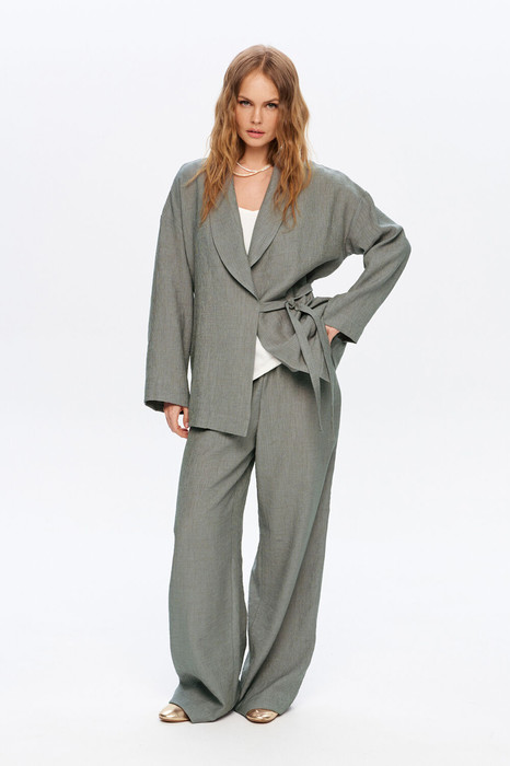 Костюм-двойка из свободной блузы с шалевым воротником и широких брюк из фактурной вискозы.