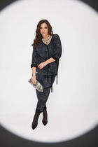 Костюм-двойка из приталенного жакета с молниями и укороченных классических брюк со стрелками.