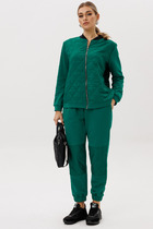 Детали: жакет прямого силуэта, пиджачный воротник, двубортная застежка на две петли и пуговицы, функциональные карманы, спинка с фигурной кокеткой, рукава втачные, жакет на подкладке. Брюки с притачным поясом со шлевками, складки у пояса, застежка на молнию и пуговицу, боковые карманы, заутюженные стрелки. Задние части брюк с вытачками и имитацией карманов.