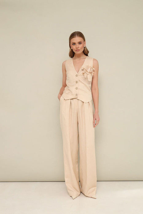 Стильный 2-х предметный комплект, состоящий из жилета и брюк из льняной ткани.