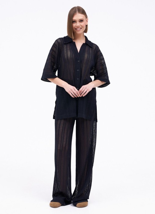 Костюм женский состоящий из блузы и брюк. Блуза свободного силуэта с центральной застежкой на петли пуговицы. Рукав цельнокроеный широкий, длиной от горловины 51 см. Воротник стояче-отложной. По боковым швам расположены 2 разреза. Брюки свободного силуэта, широкие без бокового шва. Верх брюк на подкладке с цельнокроеным поясом на резинке. Длина изделия – 79 см, длина брюк по боку – 120 см