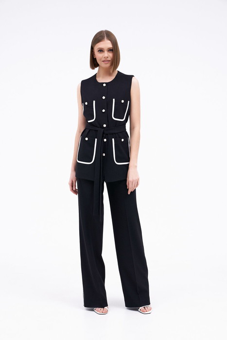 Жилет полуприлегающего силуэта с центральной застежкой на петли и пуговицы. Спереди обработаны накладные карманы по линии груди и в области бедер с контрастной окантовкой. Жилет дополнен поясом. Срез обтачки спинки и подборта окантован, без подкладки.